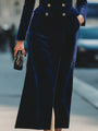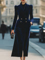 The **midnight blue velvet** long coat is a stunning embodiment of **luxury** and **sophistication**, designed to turn heads at any occasion. With its **structured double-breasted silhouette**, gold-tone embossed buttons, and flattering tailoring, this coat is a flawless choice for both evening events and elevated daytime outings.