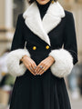 Crafted with a **premium wool-blend fabric**, this stunning coat features a striking contrast of **plush white faux fur** at the lapel and cuffs, making it an essential addition to your winter wardrobe. Its tailored silhouette and graceful A-line shape ensure it's perfect for both **formal gatherings** and chic street style during the colder months.