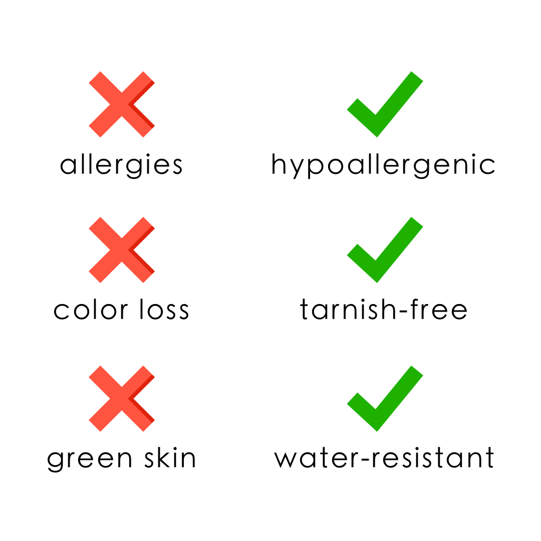 - Water, sweat, and heat resistant. (No discoloration, no oxidation).