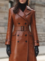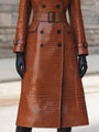 This stunning **croc-embossed** faux leather trench coat is a perfect blend of **sophistication** and modernity, designed for the discerning woman who seeks to make a statement. The deep **cognac brown** hue, coupled with a glossy finish, mimics genuine crocodile leather while upholding a commitment to sustainability.