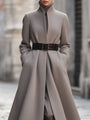This stunning taupe coat showcases a **timeless** blend of **modern tailoring** and **refined elegance**. Crafted from premium wool-blend fabric, it features a high stand collar that elongates the neckline, while the wide black waist belt with a striking gold buckle adds an element of intrigue. Perfect for winter city dressing, formal occasions, or elevated street style, this coat is a versatile addition to any wardrobe.
