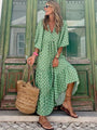 This beautiful light green bohemian maxi dress with a festive print is perfect for an elegant and vibrant look. The dress features a flowing fit that flatters your figure and is comfortable to wear.