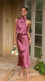 An elegant satin dress with a high neck in the colour dusty pink exudes timeless elegance and femininity. Dusty pink is a soft and romantic colour that is perfect for special occasions.