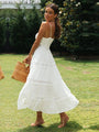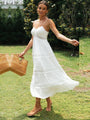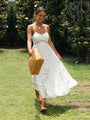 A white maxi beach dress with spaghetti straps is perfect for a day at the beach or a sunny holiday. White is a fresh and summery colour that beautifully contrasts with tanned skin.