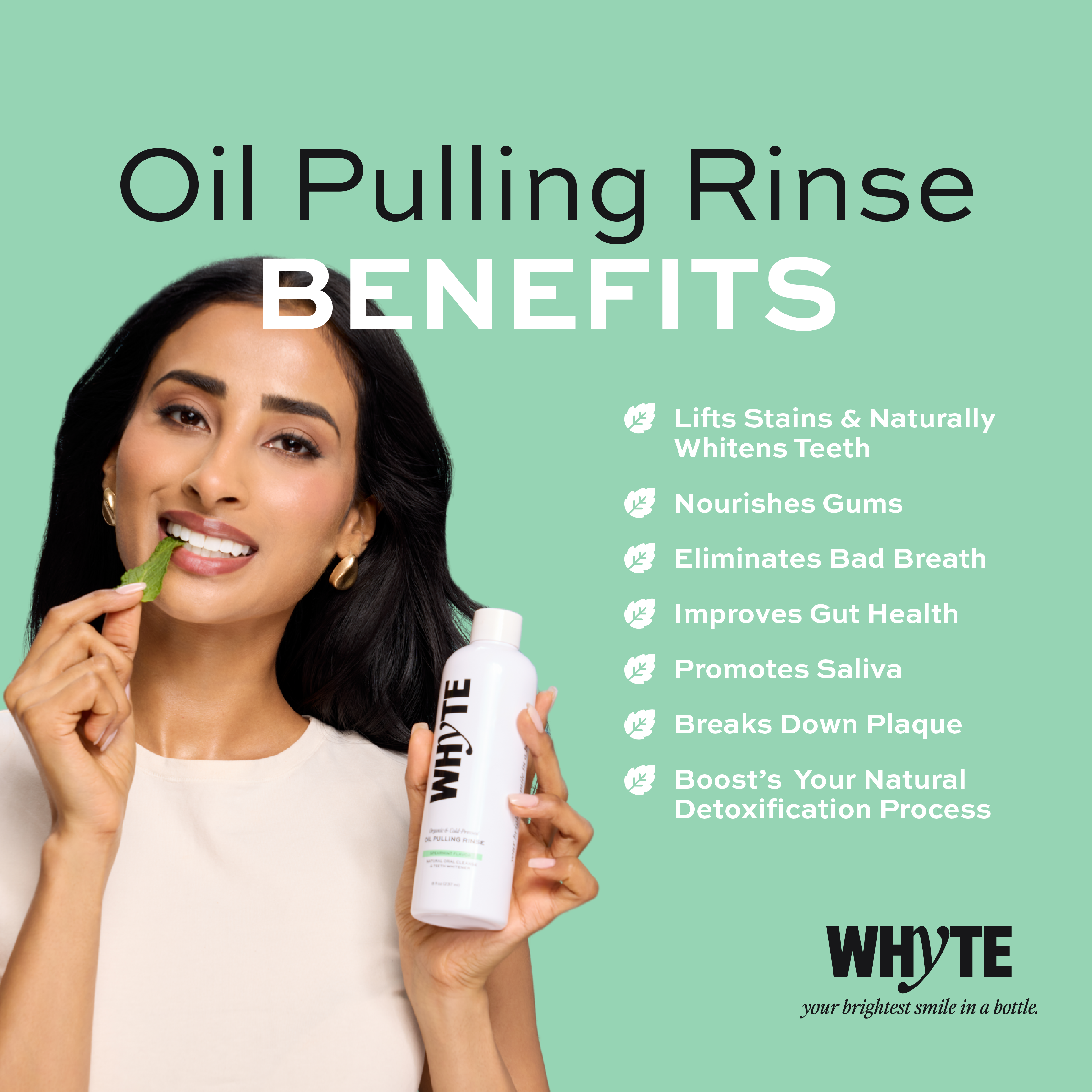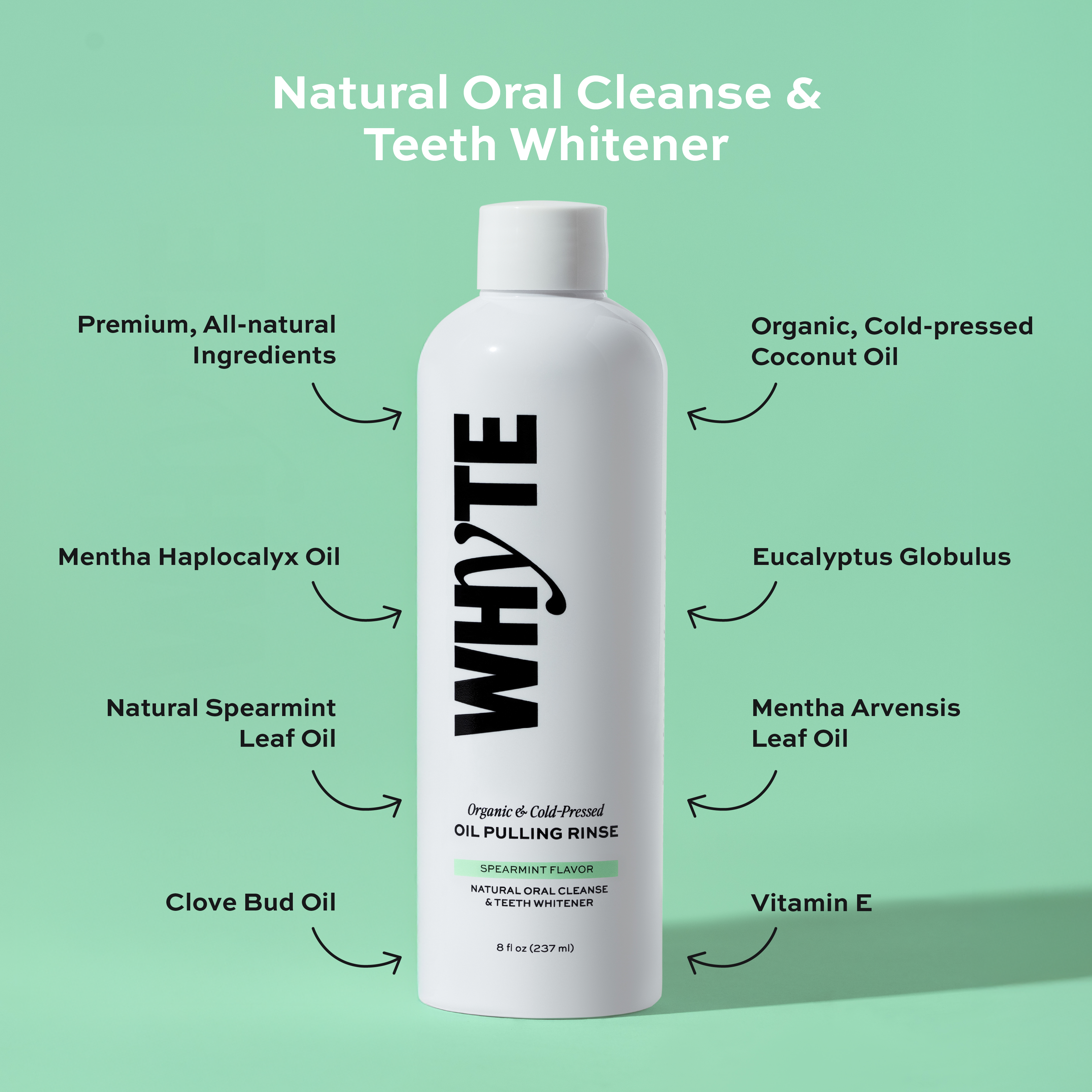 Made with organic, cold-pressed coconut oil and therapeutic essential oils, Whyte Oil Pulling Rinse supports gum health, removes toxins, and freshens breath. Free from additives and artificial flavors, it’s the perfect addition to your daily self-care routine for a cleaner mouth and brighter smile. Our Oil Pulling Rinse supports gum health, removes toxins, and leaves your breath refreshed.