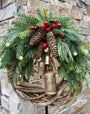 This wreath is made on a unique rustic vine base, 😇that's plenty chunky with lots of texture. 🎄It's accented with realistic looking, faux winter greens, pinecones and berries. 🛎Chunky golden bells hang center stage and ring with movement.
